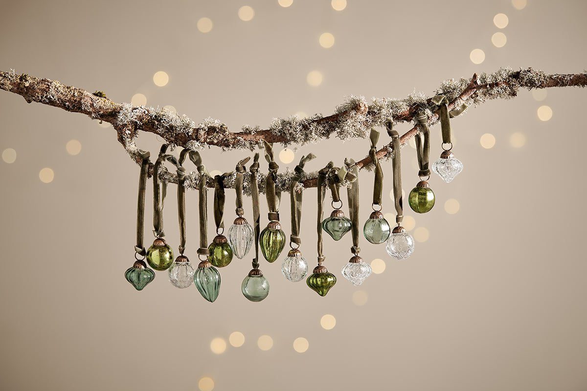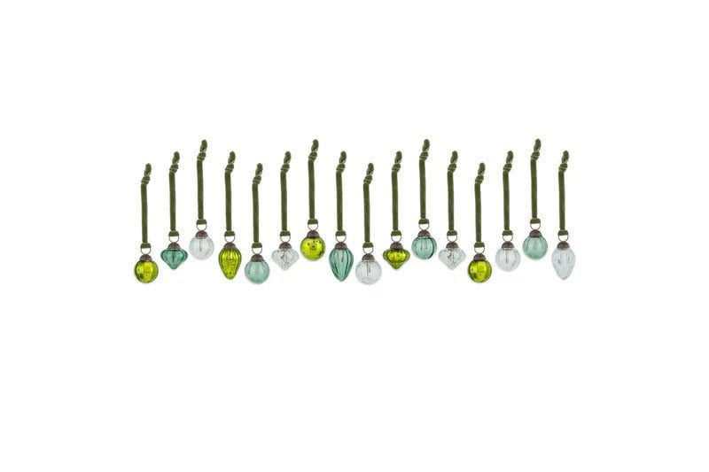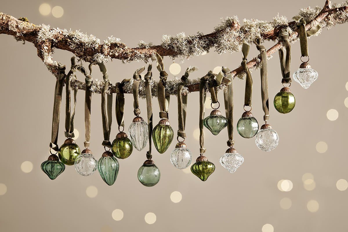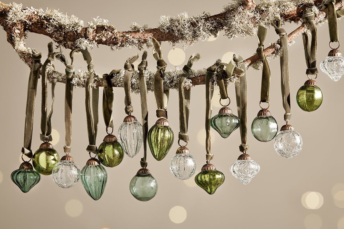 Set of 16 baubles – Mixed green and clear glass-style designs